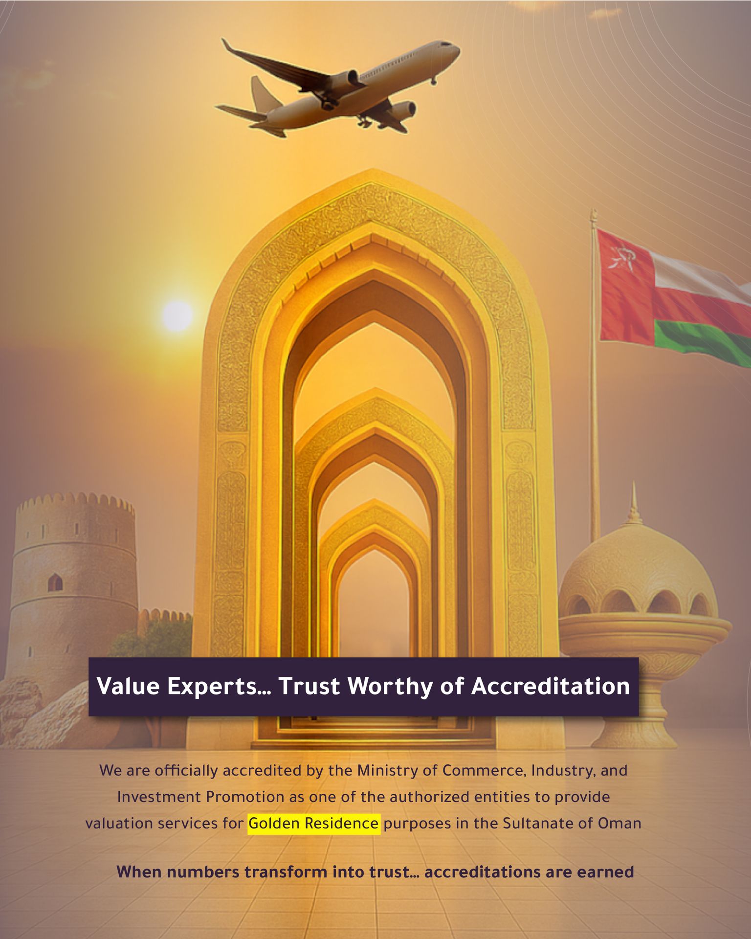 في سوق سريع التطور مثل السوق العُماني، تعتمد القرارات الاستثمارية على البيانات الدقيقة والتقييم المعتمد. واليوم بكل فخر نعلن عن اعتماد شركة خبراء التقييم رسميًا لدى وزارة التجارة والصناعة وترويج الاستثمار ضمن الجهات المخوّلة لتقديم خدمات التقييم لأغراض الإقامة الذهبية في سلطنة عُمان.
